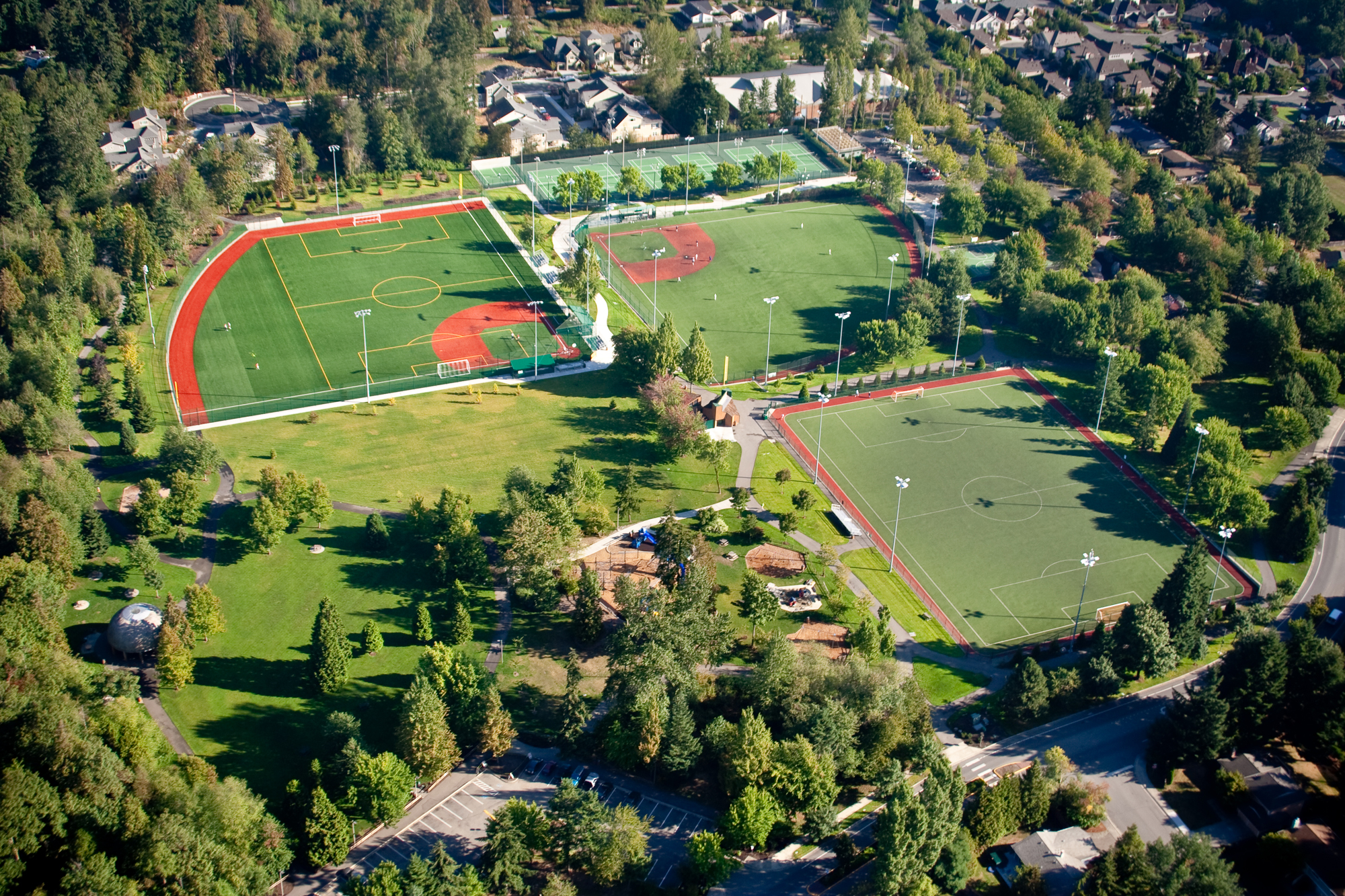 Grass Lawn Park is a 28.5-acre site in Redmond. The three-phase project transformed the site from a flood-prone sand field into a park with advanced drainage, state-of-the-art lighting, and proven environmental benefits that protect water quality in the Sammamish River. Phase 3 introduced low-impact construction practices to further enhance stormwater management and site drainage.