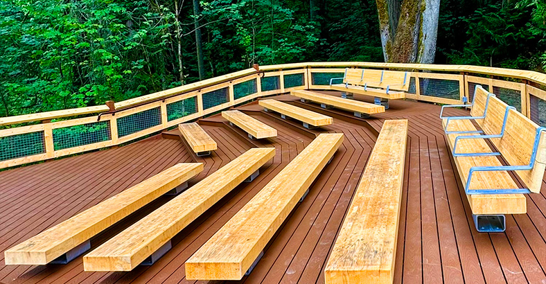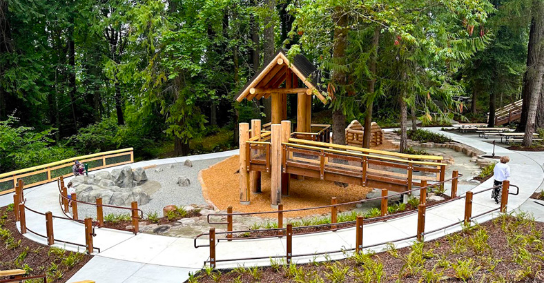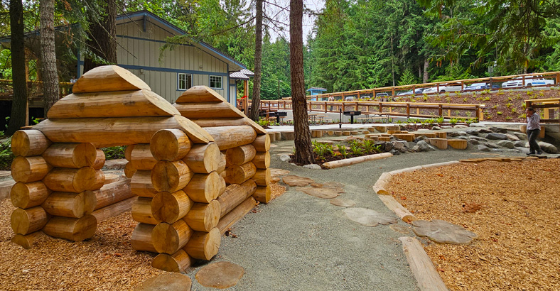 Wooden site elements like the heavy timber framing, railings, and lodge pole construction can be seen throughout the playground, event center, and the amphitheater. The wooden elements extend to the natural wooden playground and a log structure on site, as well as retaining walls and steps that are formed by logs and gravel.